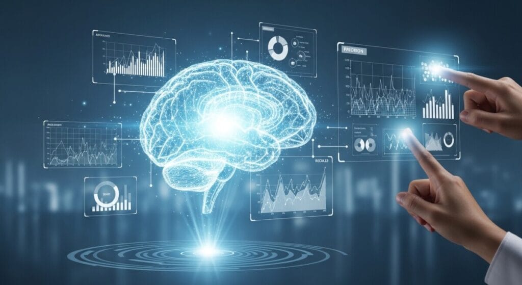 다양한 평가지표 그래프와 함께 인공지능 모델의 성능을 분석하는 과정을 보여주는 추상적인 이미지